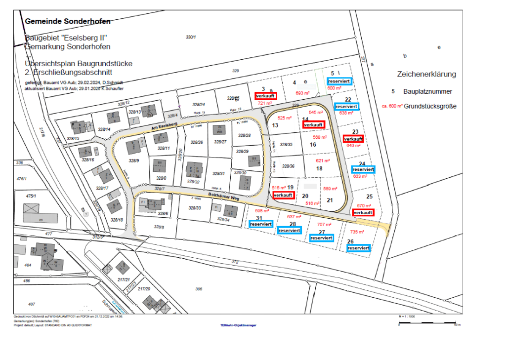 Die Gemeinde Sonderhofen hat neben dem bereits bestehenden Baugebiet „Eselsberg“, mit dem Bebauungsplan Eselsberg II weitere 30 Bauplätze nördlich der Bolzhäuser Straße ausgewiesen. Es wurden zwei Erschließungsabschnitte gebildet. Alle Bauplätze aus dem ersten Erschließungsabschnitt sind bereits verkauft. Die Erschließungsarbeiten des zweiten Erschließungsabschnittes sind weitestgehend abgeschlossen und stehen zum Verkauf bereit. Die einzelnen Grundstücke wurden bereits vermessen.