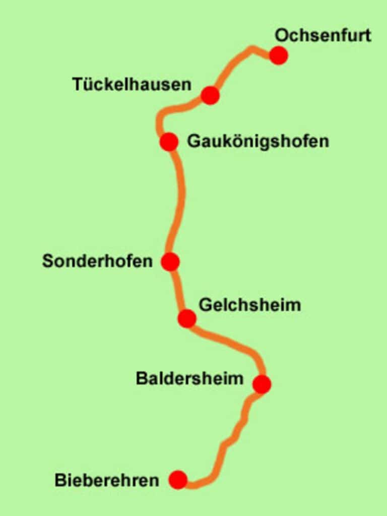 Der Gaubahnradweg ist eine Querverbindung zwischen dem Mainradweg und dem Radweg „Liebliches Taubertal“. Hierbei handelt es sich um eine ehemalige Bahntrasse die von Ochsenfurt am Main bis nach Bieberehren an der Tauber führte. Der Gaubahn-Radweg ist auf der kompletten Strecke geteert und sehr gut befahrbar. Wie bei Bahntrassen so üblich halten sich die Steigungen in Grenzen da die Eisenbahnen maximal 5% Steigung überwinden können. Von Ochsenfurt nach Bieberehren sind es ca. 26 km Fahrtstrecke. Der Gaubahn-Radweg steigt von Ochsenfurt aus ca. 20 km kontinuierlich an, während es die letzten 6 km Richtung Bieberehren dann Berg abwärts verläuft.