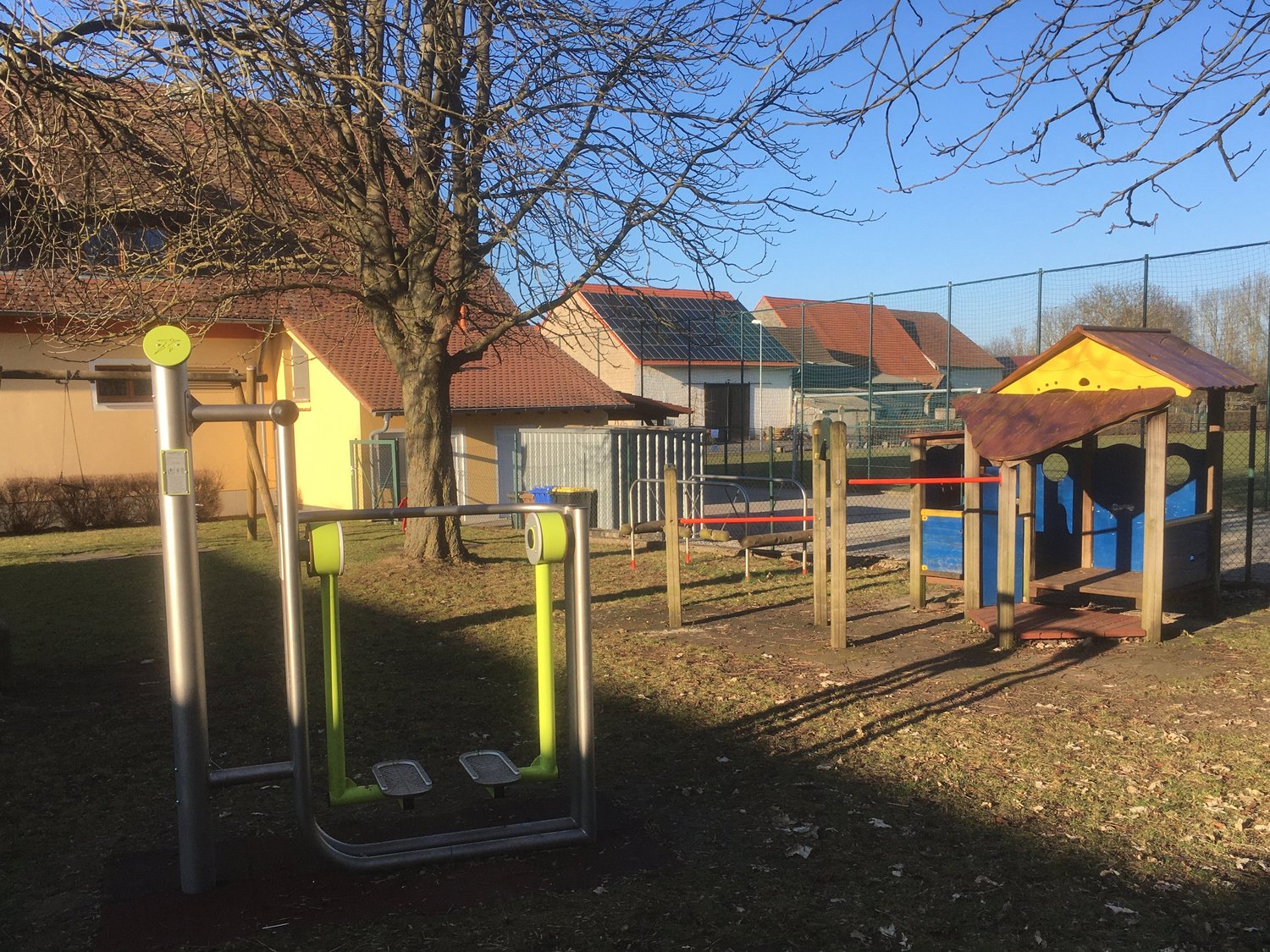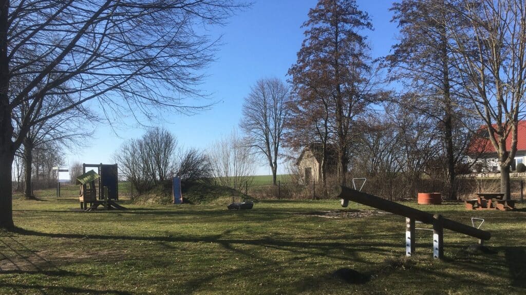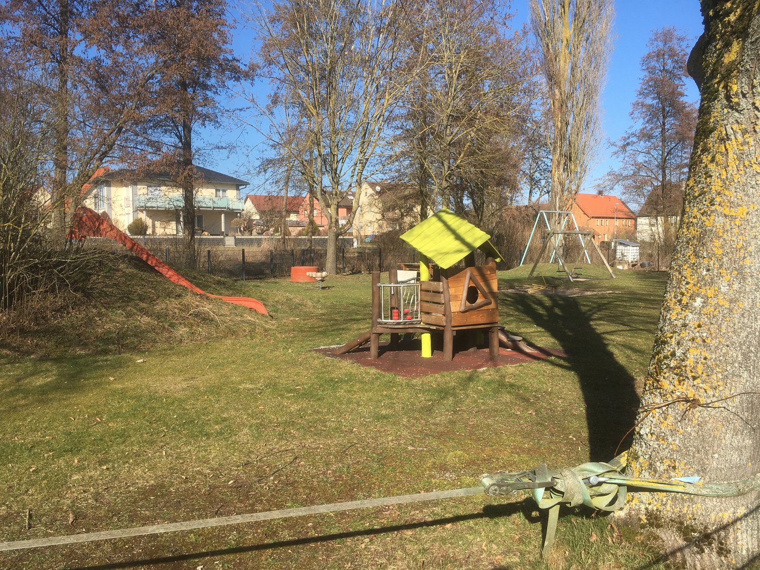 Der Spielplatz in Sonderhofen liegt etwas versteckt hinter dem Feuerwehrgerätehaus. Neben vielen Spielgeräten für die Kleinen ist auch ein „Beintrainer“ für die Erwachsenen da. Große Bäume bieten im Sommer Schatten und laden hier zum Verweilen ein.